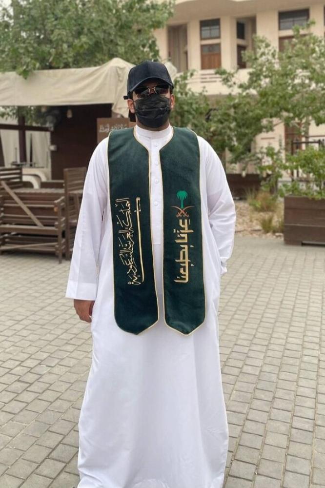 احتفل باليوم الوطني بأسلوب فاخر مع وشاح اليوم الوطني "عزنا بطبعنا" المطرز بشعار السيفين والنخلة، تصميم أنيق يجمع بين الأصالة والفخر الوطني.
