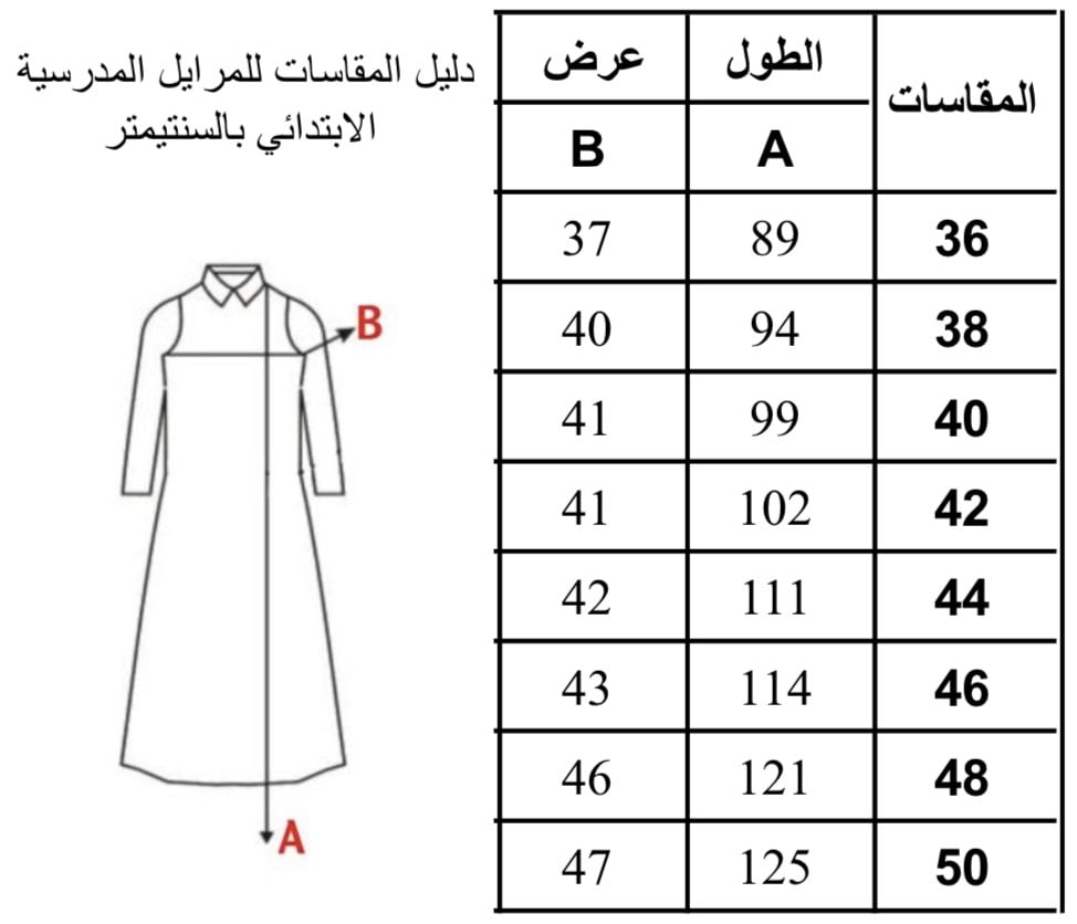 مريول بتفصيل مخصص للبنات في المرحلة الابتدائية أو المتوسطة، يتميز بتصميم متصل يمنح الطالبة مظهر أنيق ومرتب.