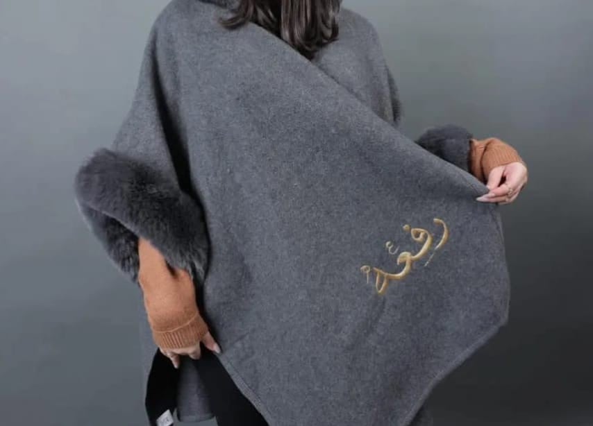 - الوانه: شال لون رصاصي غامق، مع، تطريز ذهبي، او، تطريز فضي،