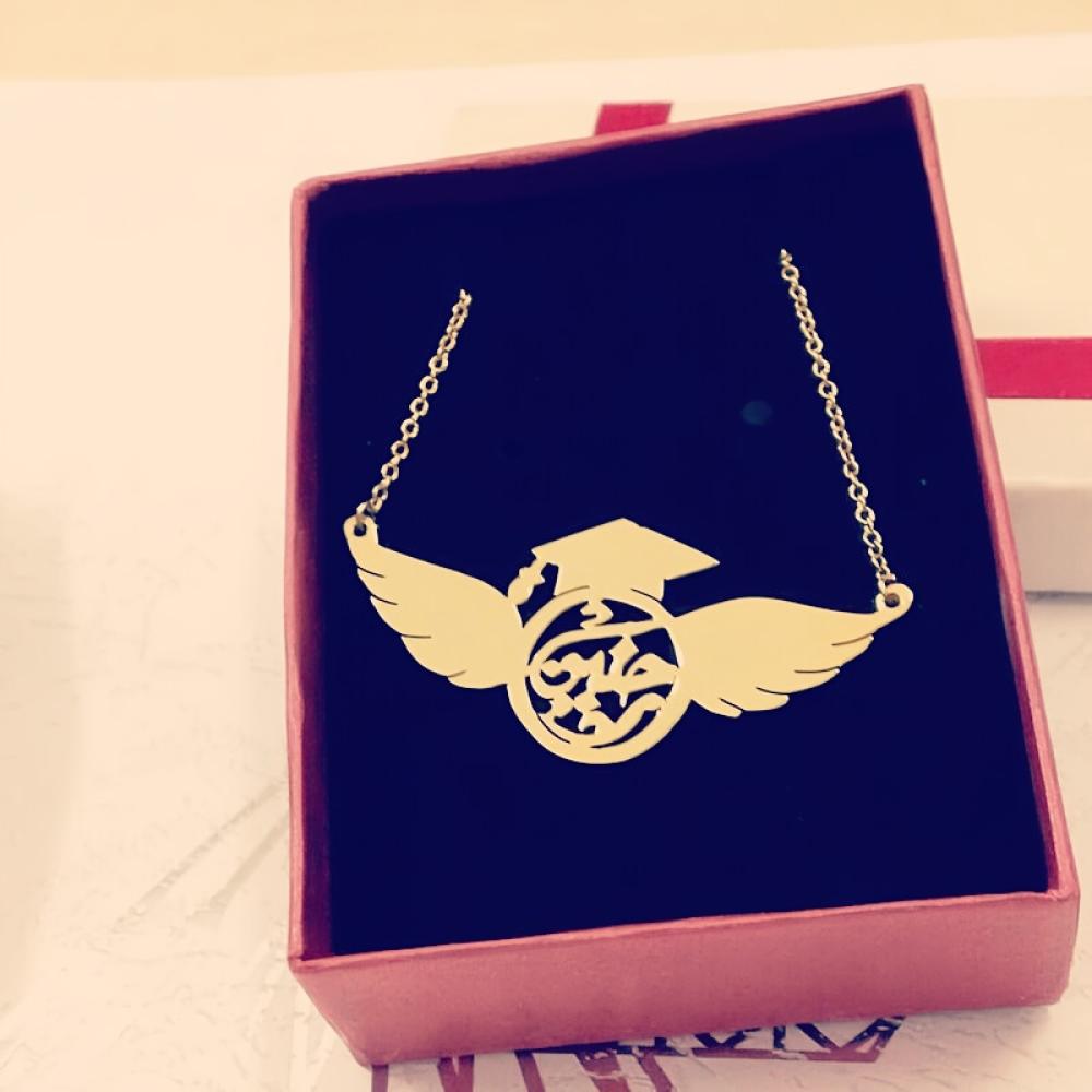سلسال تخرج جميل! إنه سلسال ذهبي اللون تفصيل خصيصاً للتخرج. بلونين، لون ذهبي او فضي، يتميز السلسال بقلادة فريدة وأجنحة على جانبي دائرة تحمل الاسم.