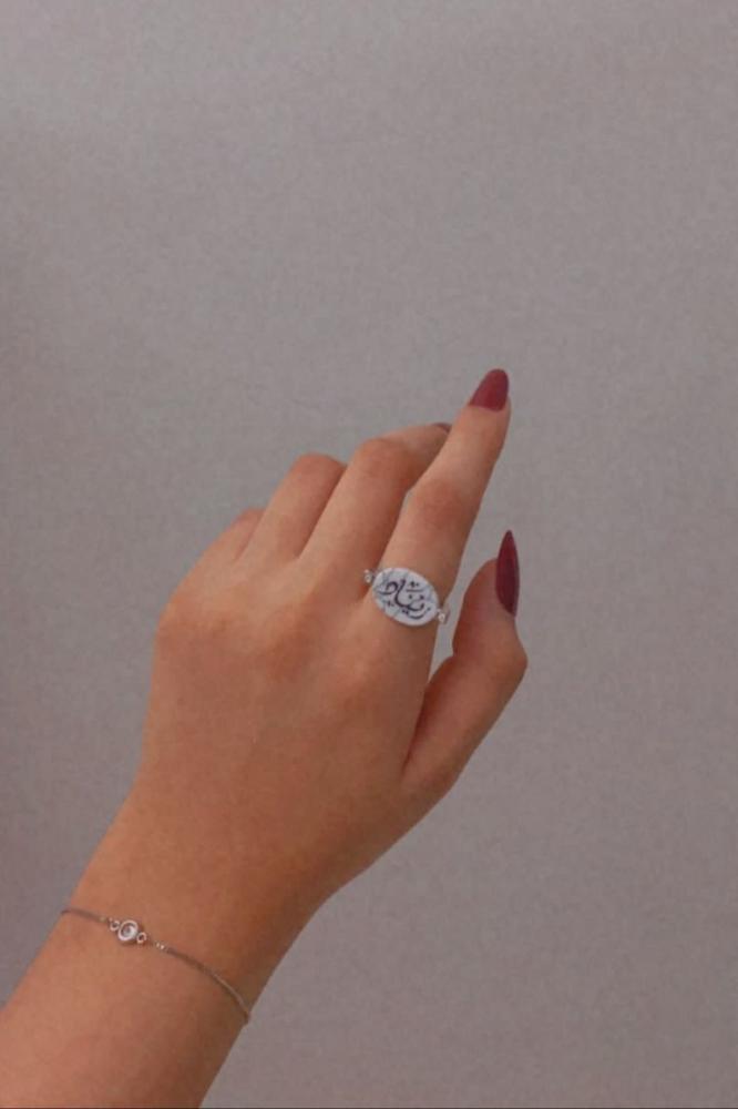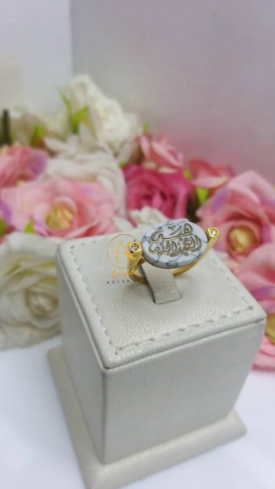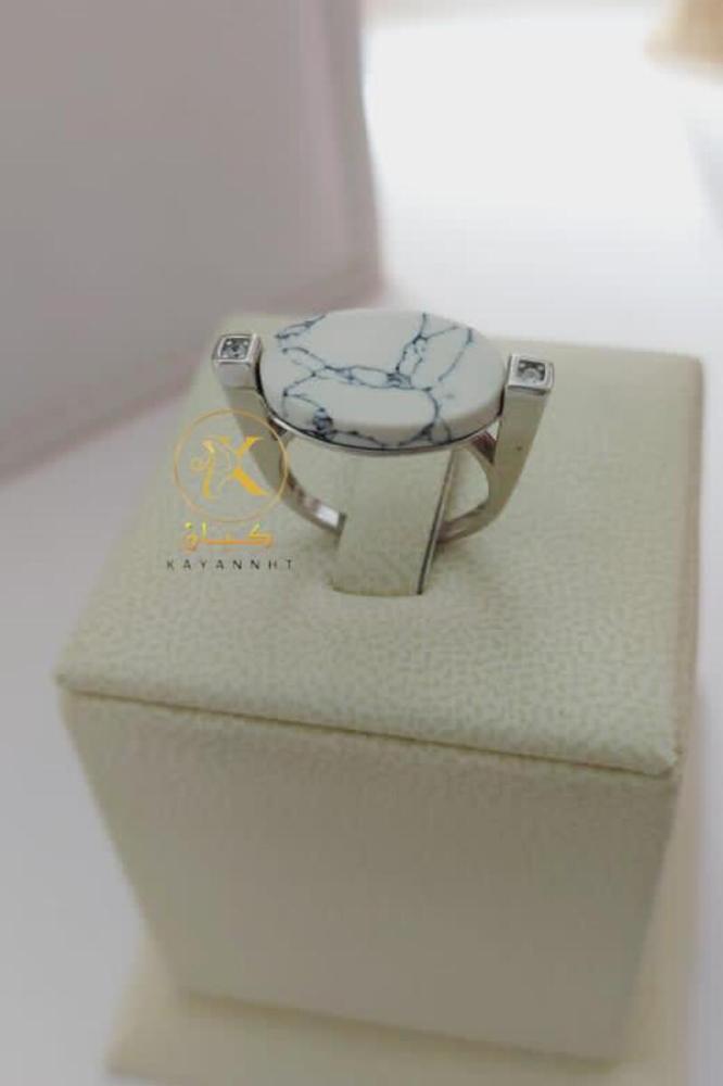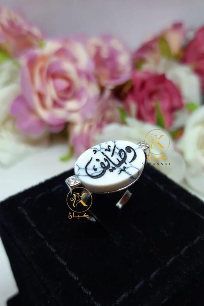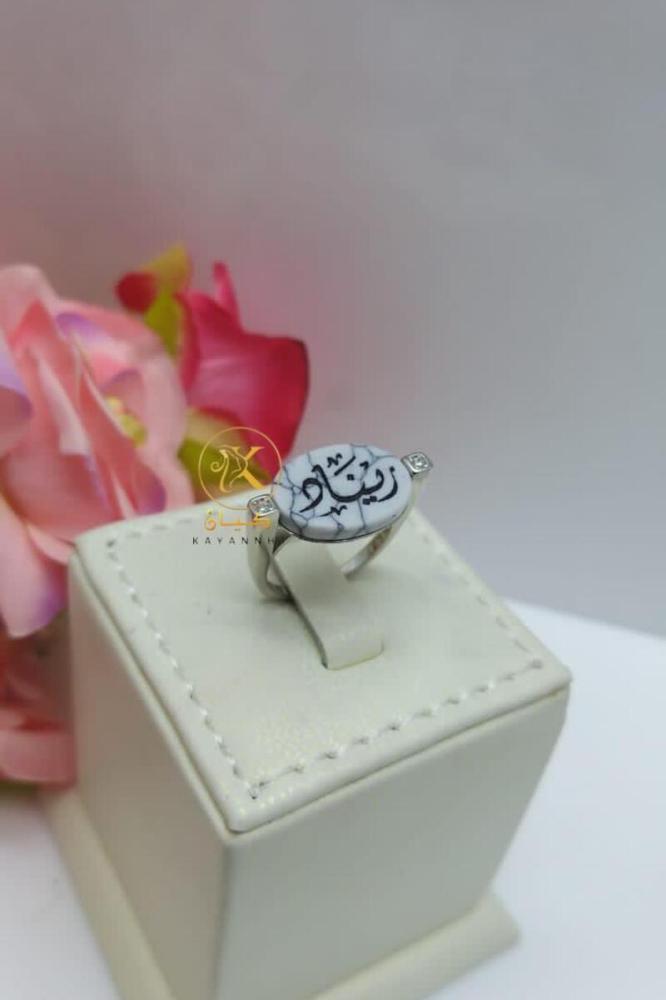 خاتم فضة ملكي مع فصين زركون يلبس الزوجين نسائي ورجالي. تصميم فريد يجمع بين الاناقه العصريه. يتميز بحجر ابيض رخامي أنيق وكتابة سوداء بارزة.