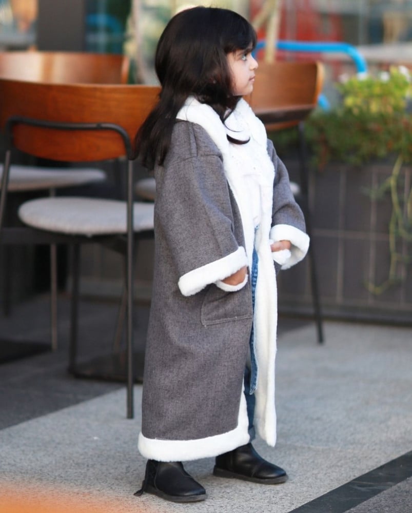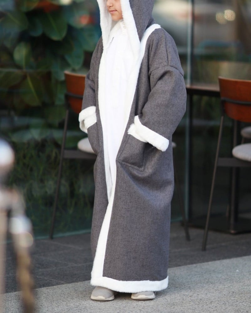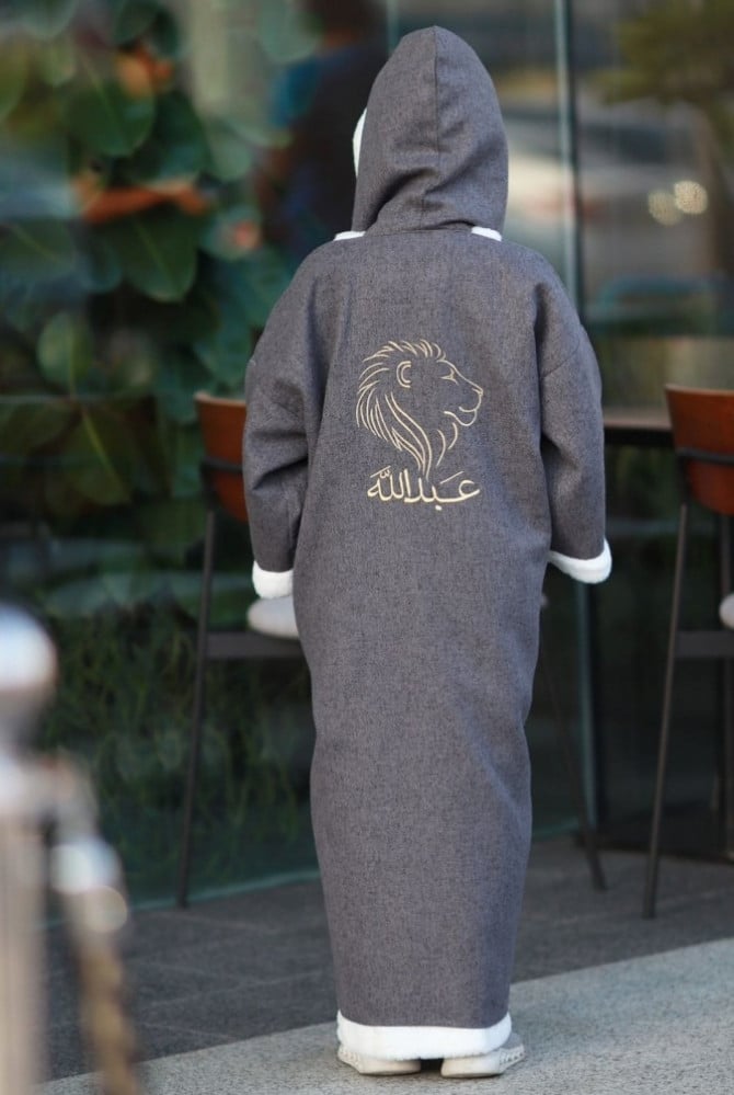 دفء وأناقة يلتقيان في فروة أطفال بلون رصاصي أنيق بتصميم مخصص يحمل اسم طفلك بأسلوب فخم يعبّر عن التميّز.