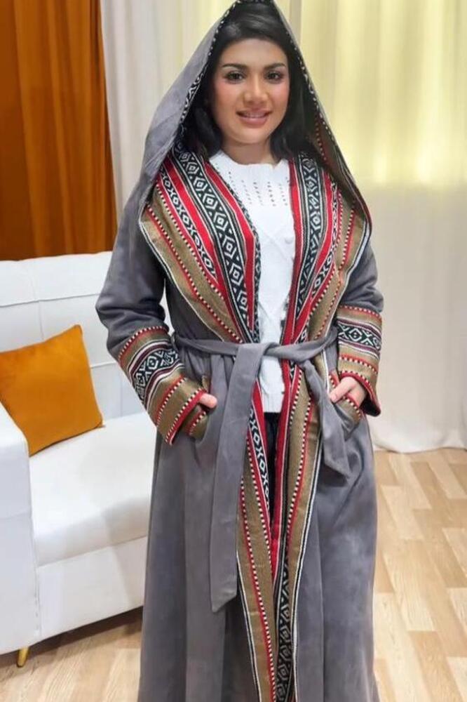 - تتميز بزخارف سدو جذابة على الأكمام وفتحة الصدر، مع قبعة مفتوحة بطابع ملكي، وجيوب جانبية وحزام يكمل المظهر بانسجام أنيق.