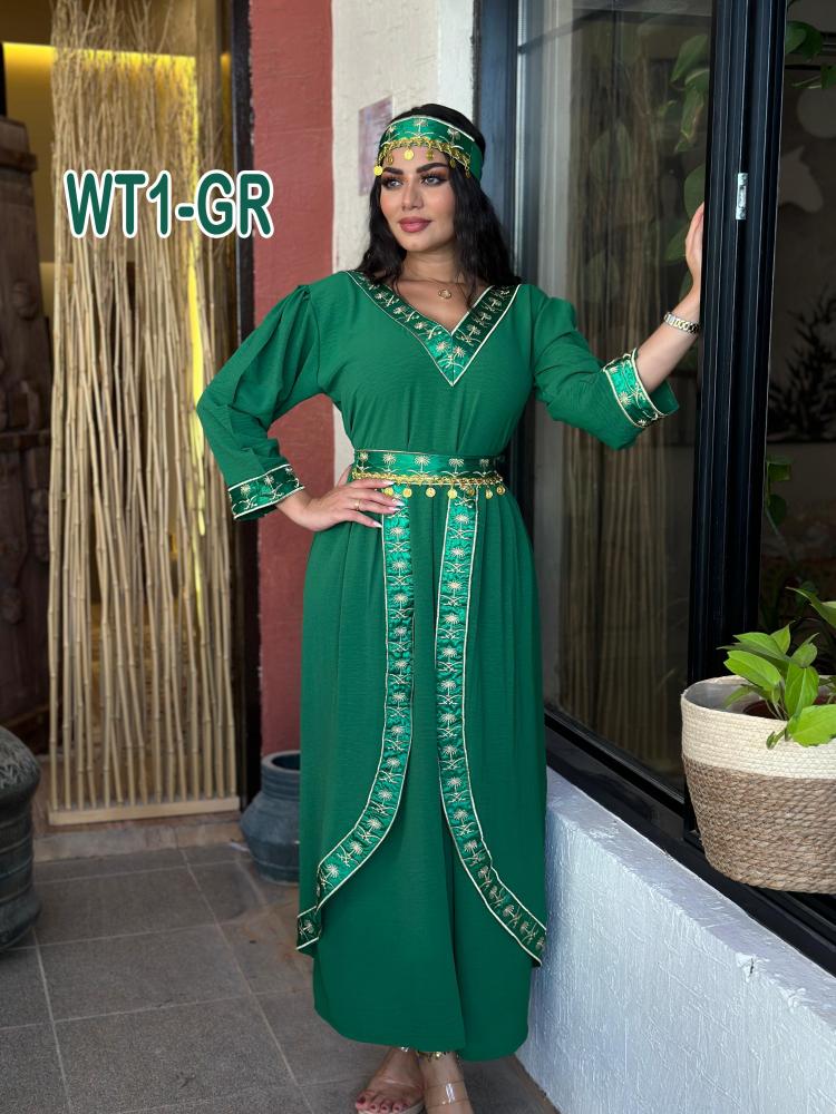 🔥🫰كولكشن الفخمممين 🫰 🔥 فستان ردة طبقتين فخم لليوم الوطني 💚 خامة قطن سي واي مع تطريز + حزام خارجي + ربطة راس صناعه سعودية 🫰😍👌🏻👌🏻👌🏻مقاسات1/2