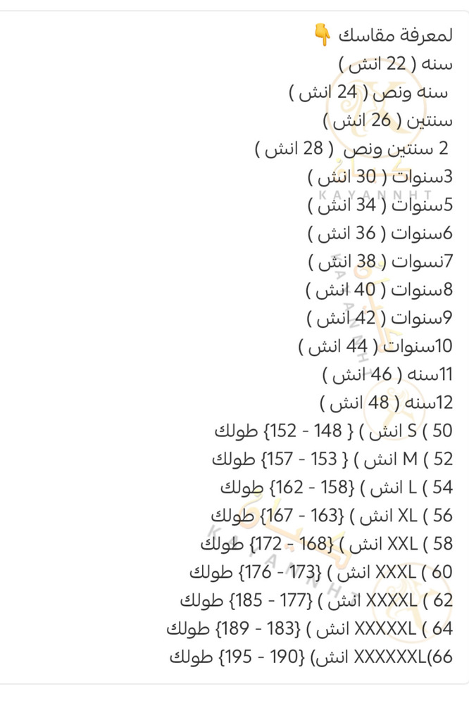 - المقاسات: من عمر سنة حتى الاعمار الكبيره الى 66 إنش دليل معرفة المقاس