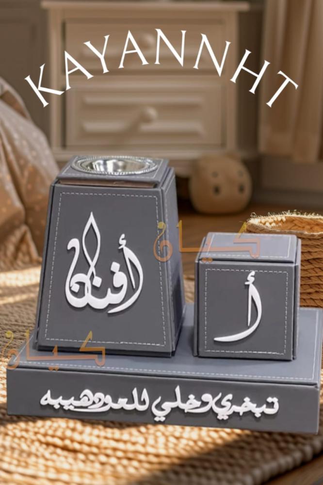 - التصميم: يتميز بتصميم أنيق وعصري، مع لمسة من التراث العربي في الخطوط المستخدمة. يتكون من صينيه قاعدة خشبية عليها جلد مستوياه مع عباره، ومبخره مع علبة بخور مكسوتين بجلد صناعي، تحملان اسماء وعبارات اكرليك قص ليزر تخصيص عل الطلب. مع عطاء مبخره فاخر يتم وضع فحم العود ولبخور عليهاء.