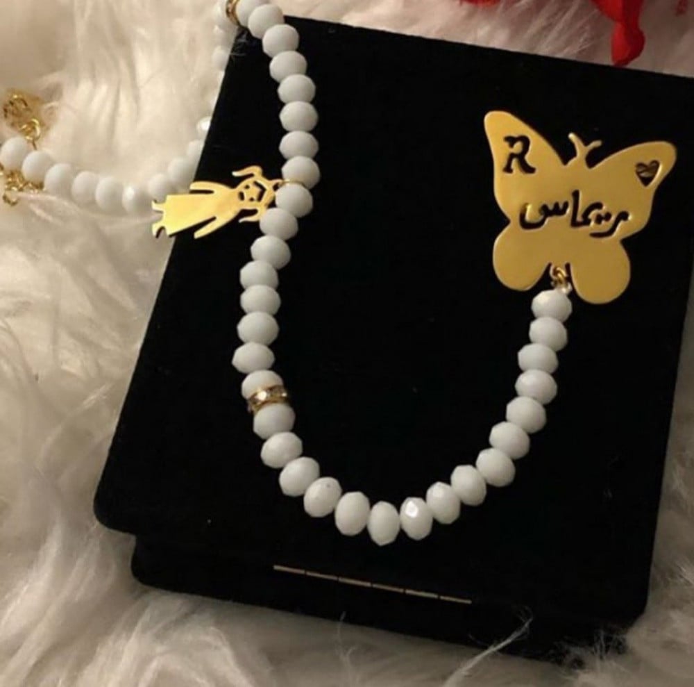 - المادة: مصنوع من النحاس مع خرز لؤلؤء ويتم طلاء الاسم بماء الذهب او الفضه بتصميم فاخر.