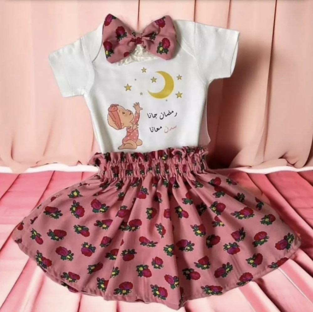 • طقم يتكون من، تنورة، تيشرت، ربطة شعر على شكل فيونكه.