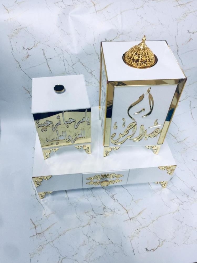 - مكوناته: طقم صينية المبخر مكون من. صينيه مع درج. مبخره باسم عل الطلب. عليه بخور باسم أو عباره عل الطلب
