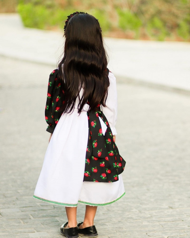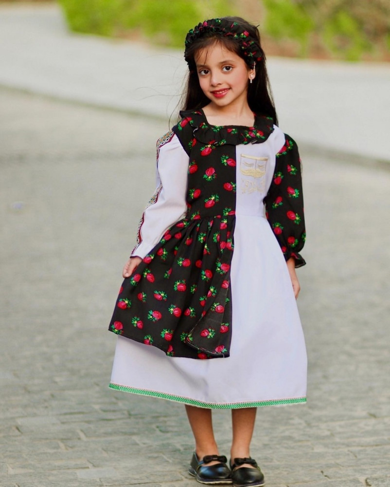 الفستان عباره عن موديل بشكل حضري. مدموج بقماش الشالكي الشعبي التراثي ممزوج بنقوش السدو للحضاره العريقه والاصليه