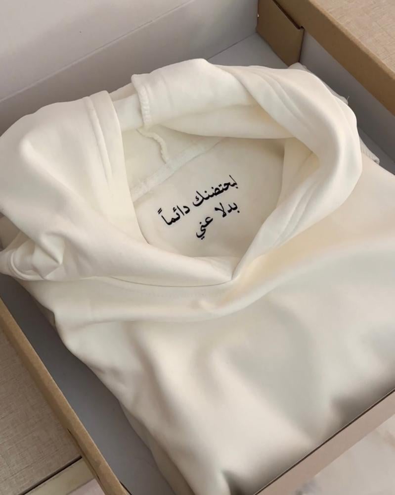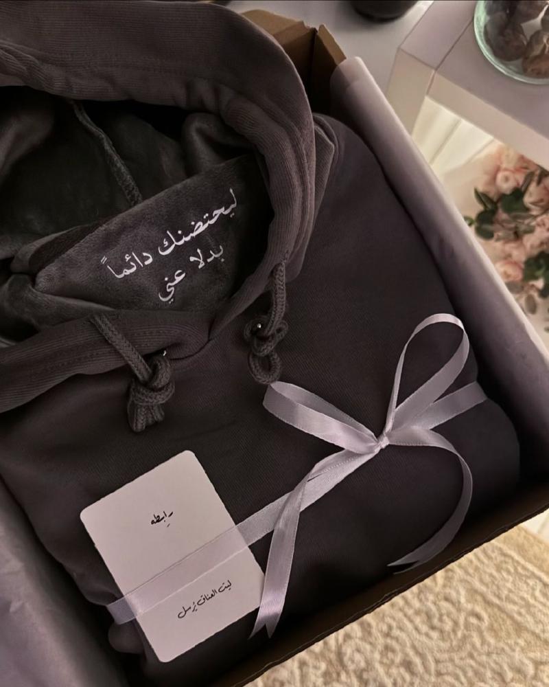 مصنوع من أفخم الخامات وبداخله رسالة دافئة تقول: ليحتضنك دائمًا بدل عني، كأنك تاخذ حضن دافي معك وين ما تروح. اختر لونك المفضل من الرصاصي، الأسود، الأبيض، أو الكحلي، واستمتع بتغليف مميز مجاني وكرت برسالة منك. كما يمكنك تغيير الرسالة داخل الهودي حسب طلبك، لتجعله الهدية المثالية لشخص غالي عليك.