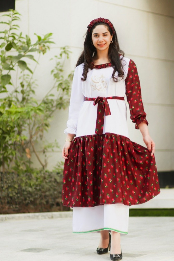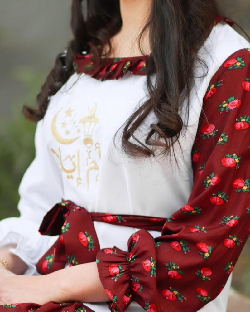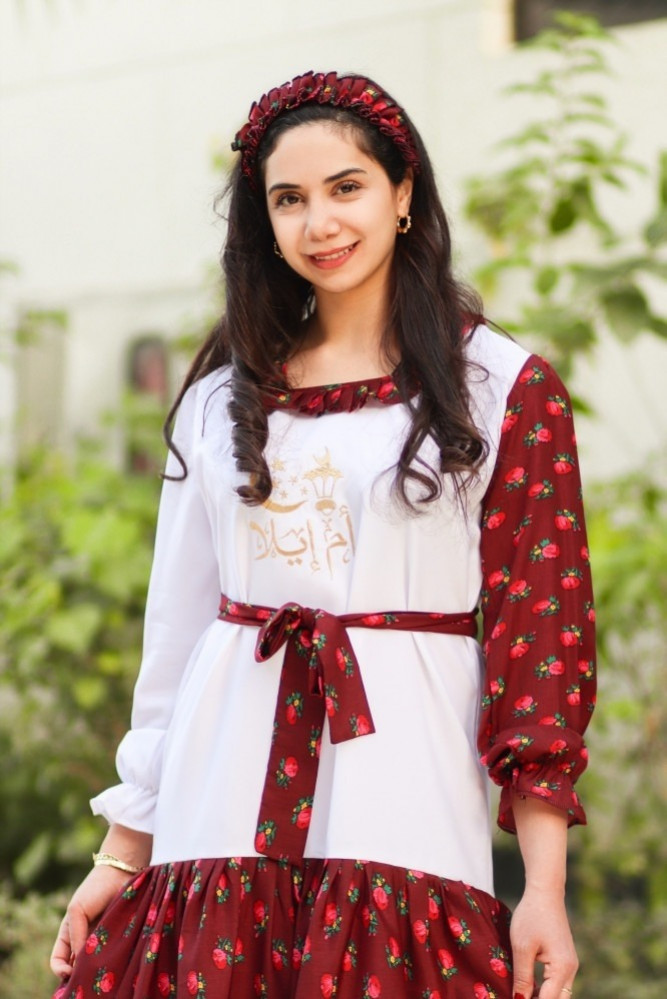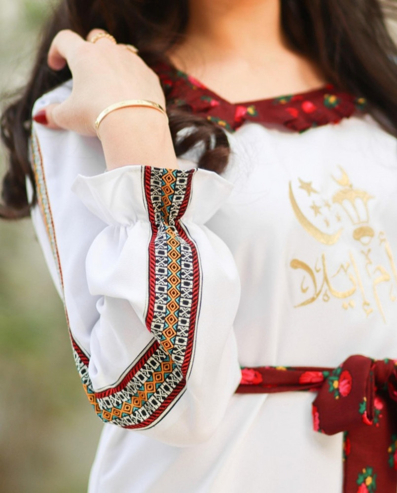 الجلابية عباره عن موديل بشكل حضري. مدموج بقماش الشالكي الشعبي التراثي ممزوج بنقوش السدو للحضاره العريقه والاصليه