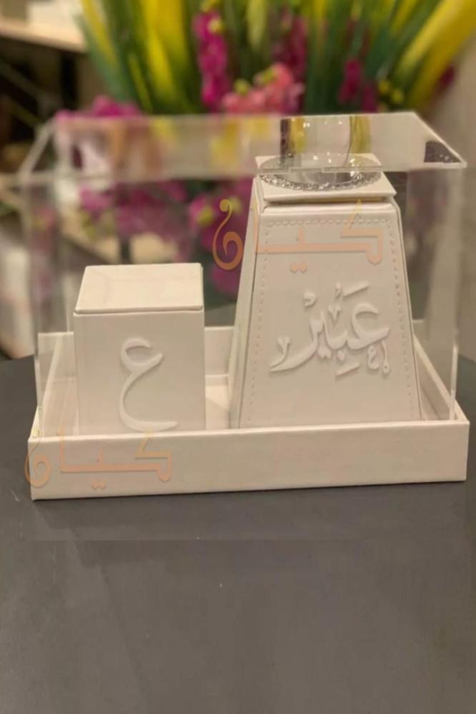 - التصميم: يتميز بتصميم أنيق وعصري، مع لمسة من التراث العربي في الخطوط المستخدمة. يتكون من صينيه قاعدة خشبية عليها جلد مستوياه مع عباره، ومبخره مع علبة بخور مكسوتين بجلد صناعي، تحملان اسماء وعبارات اكرلك قص ليزر تخصيص عل الطلب. مع غطاء مبخره فاخر يتم وضع فحم العود ولبخور عليهاء.
