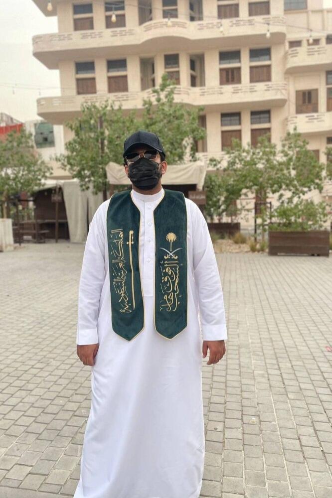 - التطريز: شعار السيفين والنخلة بدقة عالية على جهة الوشاح لتفاصيل بارزة وواضحة.