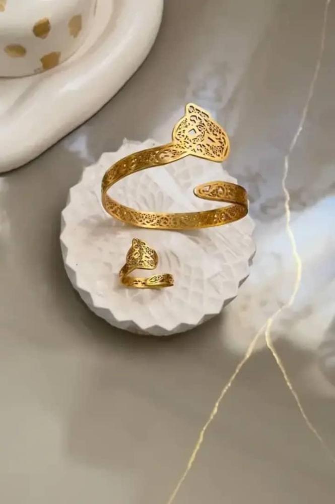 تالقي باسلوبنا الفريد مع هذا الطقم الذهبي الجذاب، الذي يتكون من أسوره مفتوحم مع خاتم مفتوح متناسق، وكلاهما تم تزيينهما بتصميم نقش بحرف عربيه مطلي بلمسة ذهبية او فضيه فاخرة.